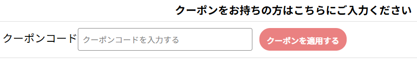 ・商品をカートに入れたのち、ご注文内容の確認画面にてクーポンコードの入力をお願いいたします。