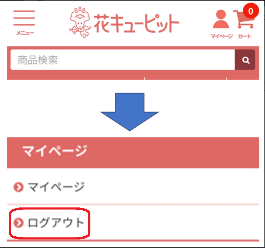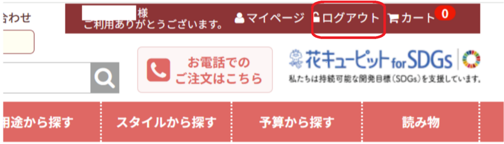 花キューピットのログアウト方法についてご案内いたします【PCから】画面右上にある「ログアウト」をクリックしてください。【モバイルから】左上のメニューからログアウトをお選びください。下方向にスクロールするとログアウトの表示がございます。